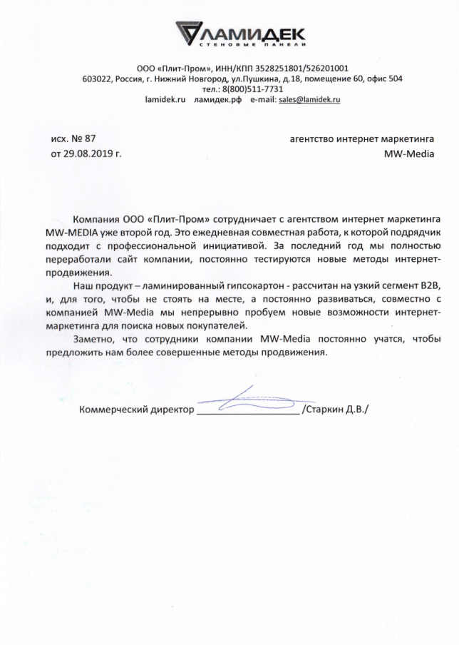 Компания ООО "Плит-Пром" сотрудничает с агентством MW-MEDIA уже не один год.