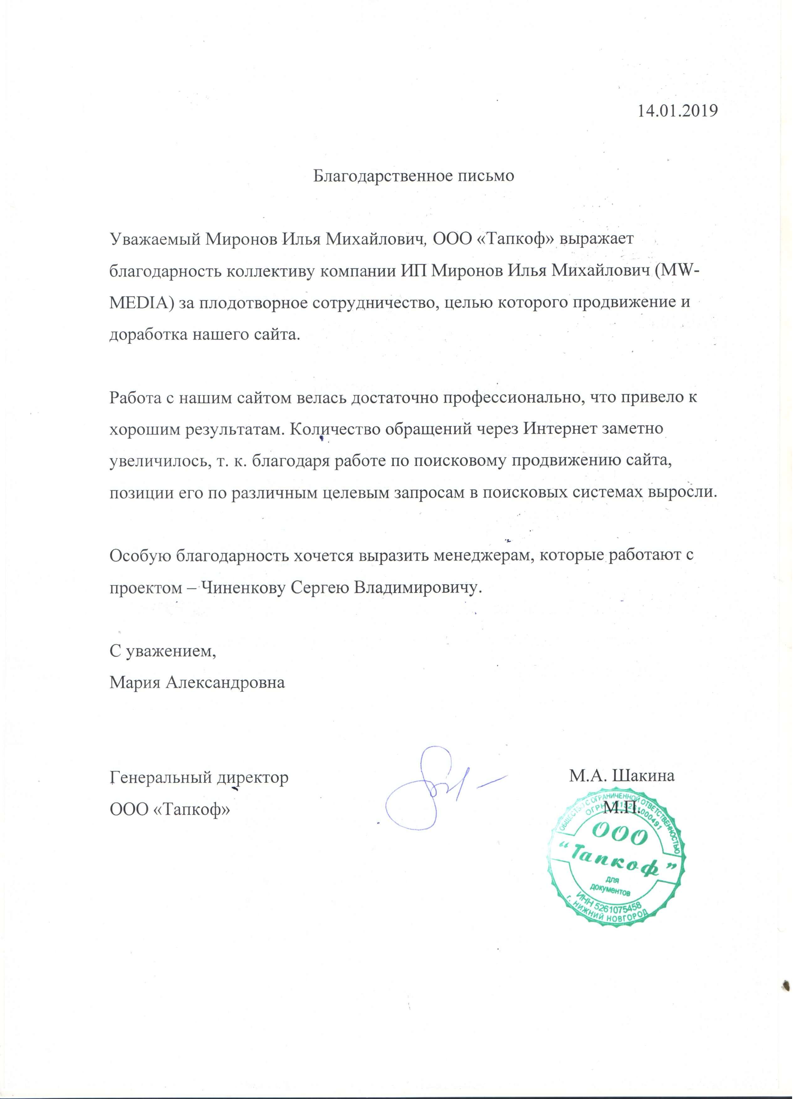 ООО "Тапкоф" выражает благодарность коллективу компании MW-MEDIA